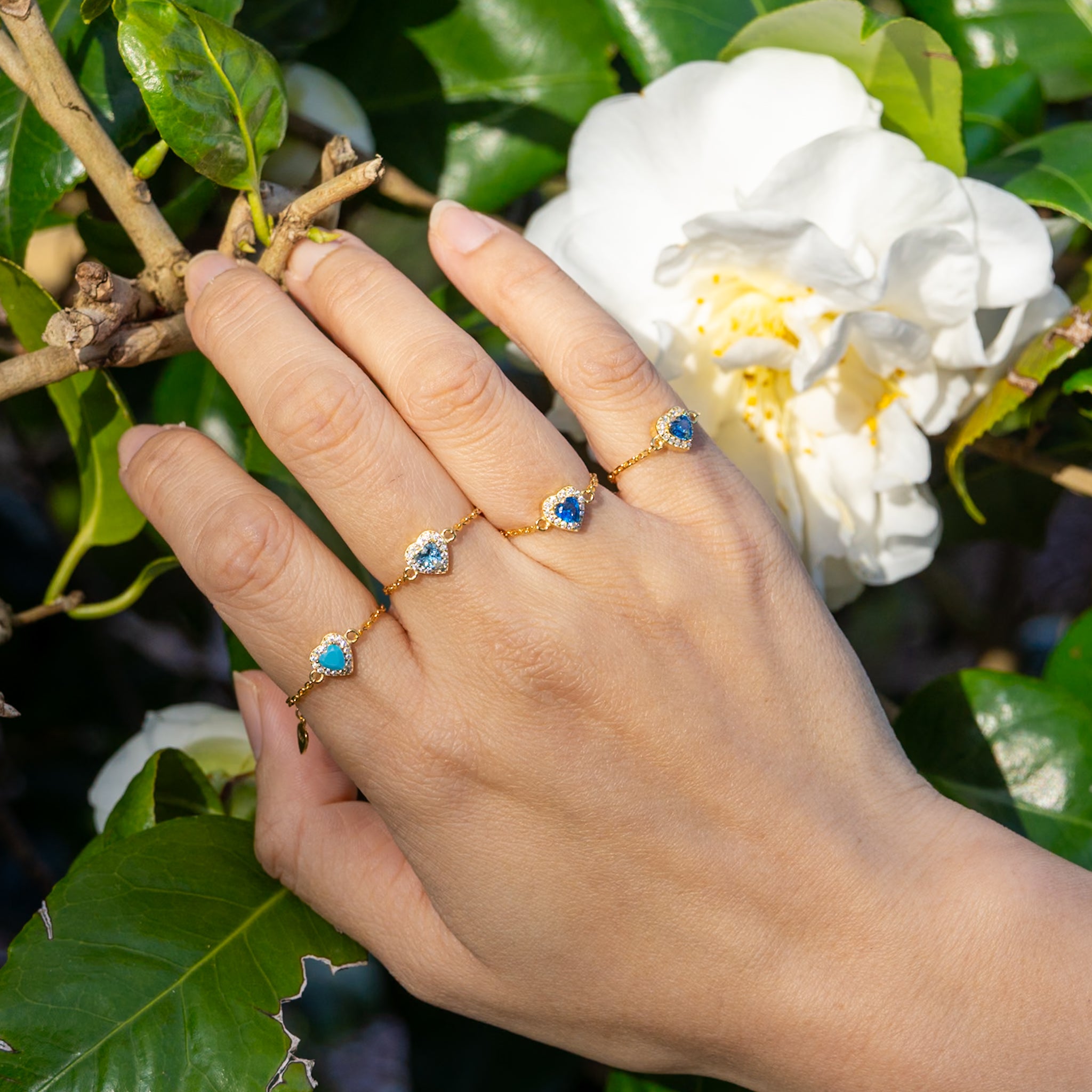 With its calming hue, the blue ring evokes a sense of peace, clarity, and trust. Crafted from 18-carat gold-plated silver, the adjustable zipper design fits all finger sizes. It symbolizes the opening of hidden moods and quiet inner shifts. Let the color speak to your heart—worn with intention on your fingers.