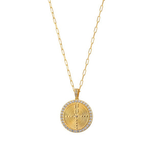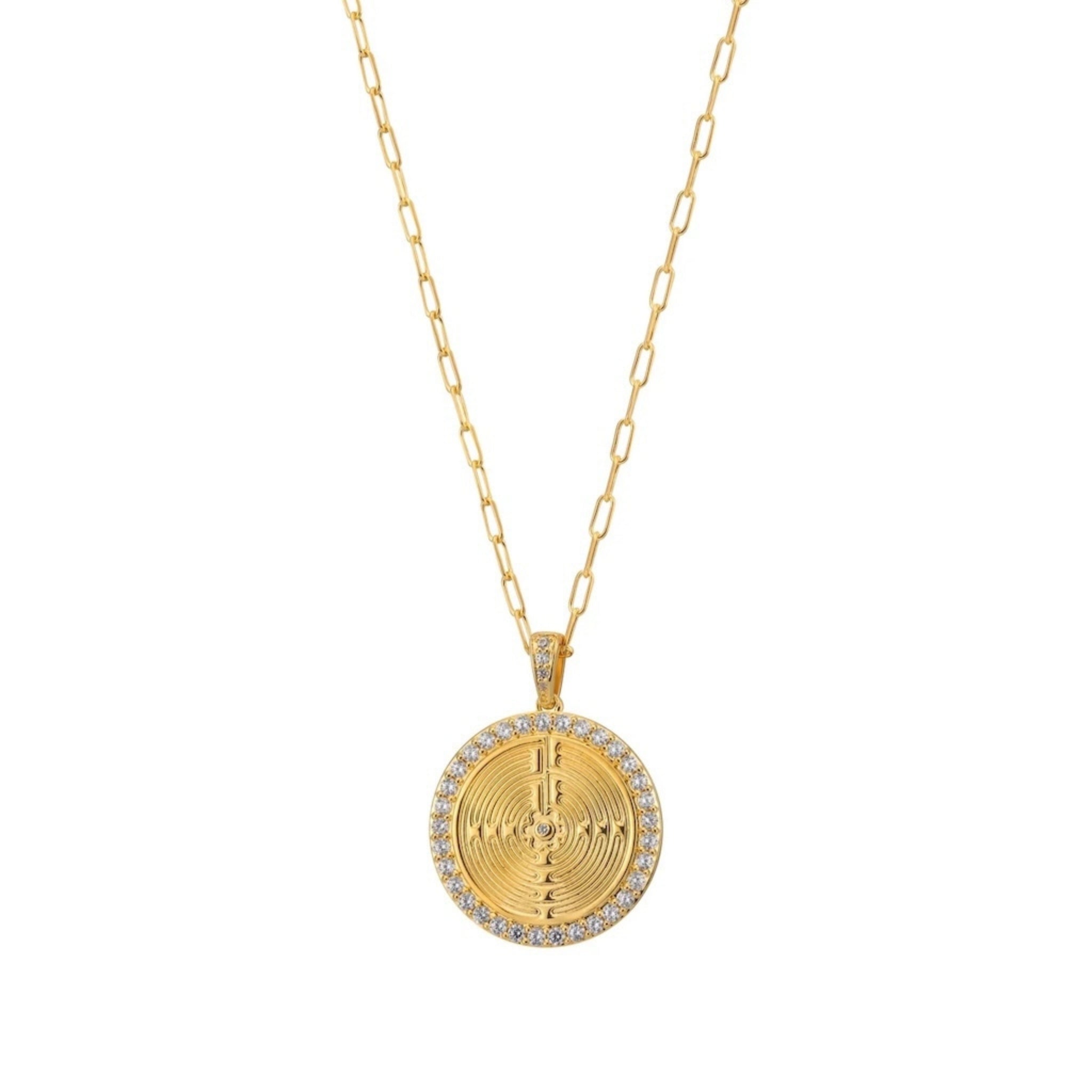 The Sanctum Necklace blends spiritual symbolism with timeless elegance. Inspired by the labyrinth of Chartres Cathedral, its detailed pendant—framed in shimmering pavé crystals—represents life’s journey and personal transformation. A hidden Latin engraving, Credere in Processu ("Trust the Process"), adds meaning to this gold-plated statement necklace, perfect for mindful, modern women.