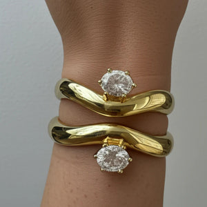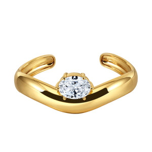 SELL WITH USA sculptural gold-tone cuff with a fluid wave shape and bold solitaire CZ. Minimalist, modern, and designed to stand out effortlessly.